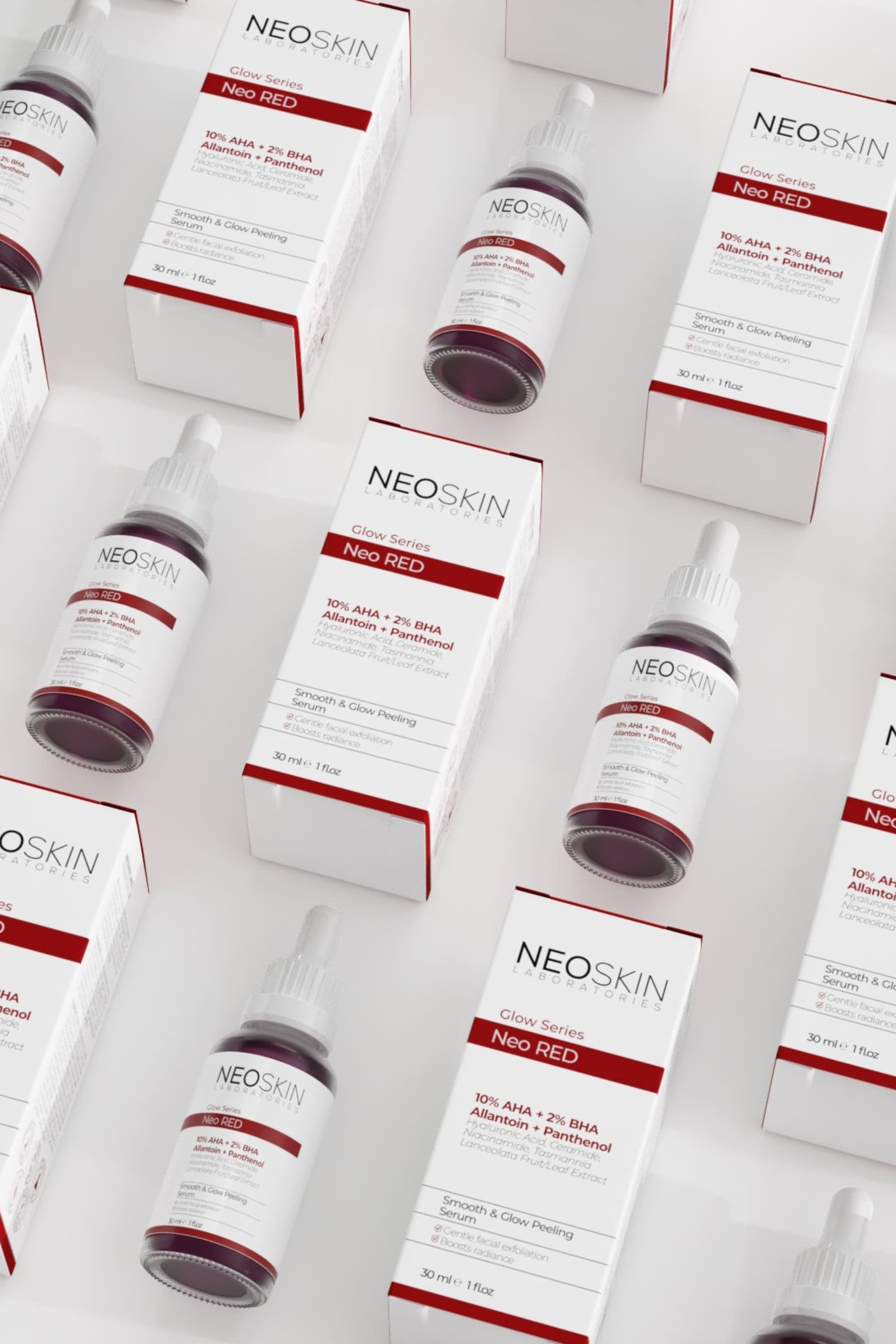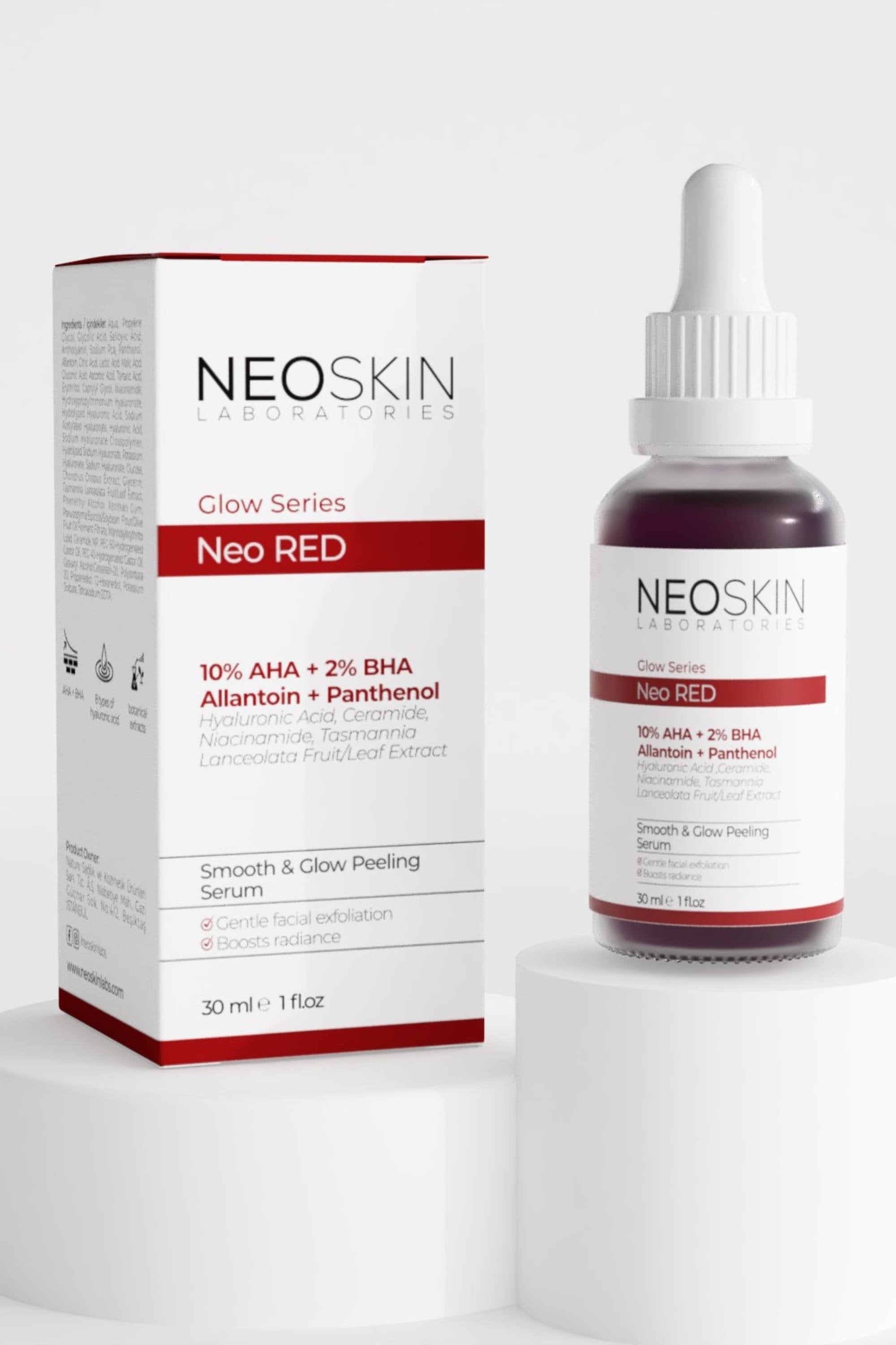%10 Alfa Hidroksi Asit ve %2 Beta Hidroksi Asit içeren Neoskin Neo Red serum, cildin mikro eksfoliasyon ile soyulmasını sağlar, ölü hücrelerden, siyah nokta ve fazla sebumdan arındırılmasına yardımcı olur.
